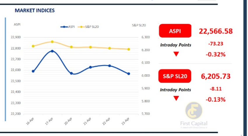 Amid global uncertainties surrounding the US–Iran peace talks and investor concerns over the potential negative economic impact on the Sri Lankan economy from escalating US–Iran tensions, the Colombo Bourse concluded the session in negative territory, declining marginally by 73 points to close at 22,567.