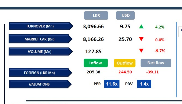 Capital Goods sector led the daily turnover with a share of 35%, followed by the Banking, and Food Beverage & Tobacco sectors collectively contributing 28%. Foreign investors turned net sellers, posting a net outflow of LKR 39.1Mn