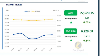The ASPI edged up by 8 points to close at 22,620, while the S&P SL20 gained 15 points to settle at 6,230. CINS, COMB, JKH, ACL, and DIAL emerged as the top positive contributors to the ASPI.