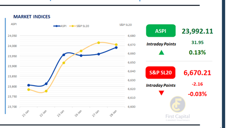 ASPI gained 32 points to close at 23,992. S&P SL20 dropped by 2 points to close at 6,670. Top positive contributors to the ASPI were CINS, SFCL, JKH, CTHR and COOP.
