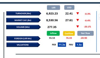 Capital Goods sector led the daily turnover with a share of 22%, followed by the Real Estate Management & Development, and Insurance sectors collectively contributing 31%. Foreign investors remained net sellers, posting a net outflow of LKR 20.9Mn.