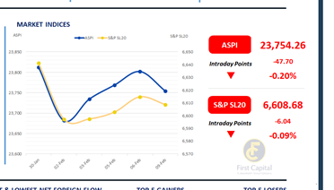 ASPI dipped 48 points to close at 23,754, while the S&P SL20 edged down by 6 points to finish at 6,609. Top negative contributors to the ASPI were JKH, SFCL, DOCK, TKYO and CARG.