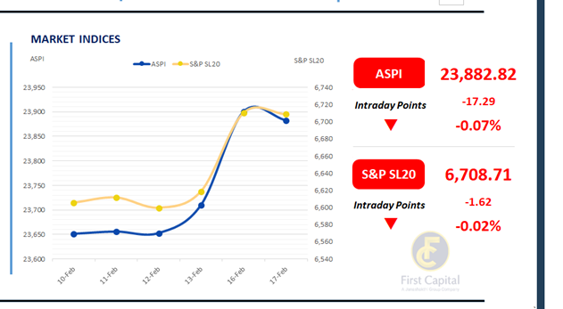 Indices recorded modest declines but recovered part of the losses toward the close. ASPI declined by 17 points to close at 23,883, while the S&P SL20 dropped 2 points, closing at 6,709. Leading negative contributors to the ASPI were CTHR, PABC, DIMO, DFCC and RICH.