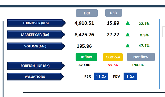 Meanwhile, the Capital Goods sector emerged as the leading contributor to daily turnover, accounting for 27% of total market activity. The Banking and Diversified Financials sectors followed, collectively contributing 25% to overall turnover. Foreign investors turned net buyers, posting a net inflow of LKR 194.0Mn.