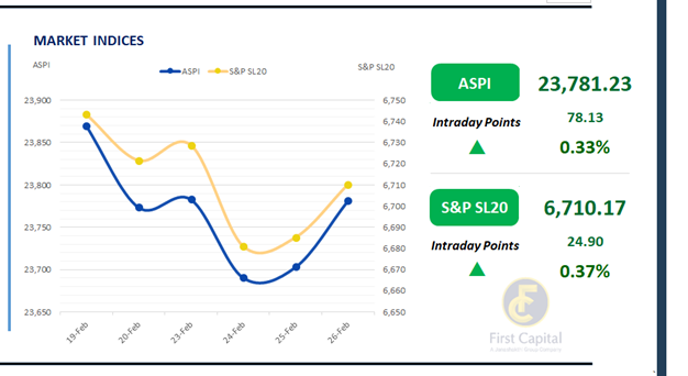 ASPI advanced by 78 points, to settle at 23,781 and S&P SL20 gained 25 points, to close at 6,710. JKH, HAYL, MELS, AEL and LMF emerged as the key positive contributors to the index.