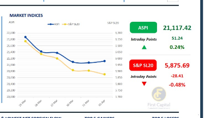 The market ended on a positive note today, with the ASPI gaining 51 points to close at 21,117, while the S&P SL20 index moved in the opposite direction, declining by 28 points to settle at 5,876, primarily weighed down by ex–dividend adjustments in major banking counters.