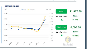 In line with this momentum, the Colombo Bourse concluded the session in positive territory, with the ASPI registering a significant increase of 885 (4.2%) points to close at 21,918.