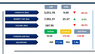 Daily turnover stood at LKR 3.1Bn, marking a decrease of 24.9% over the monthly average of LKR 4.1Bn. Diversified Financials sector led the daily turnover with a share of 26%, followed by Consumer Service, and Capital Goods sectors collectively contributing 32%. Foreign investors remained net sellers, posting a net outflow of LKR 119.4Mn.