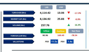 Daily turnover stood at LKR 4.1Bn, marking an increase of 6.1% over the monthly average of LKR 3.9Bn. Capital Goods sector led the daily turnover with a share of 19%, followed by the Diversified Financials, and Banking sectors collectively contributing 27%. Foreign investors remained net sellers, posting a net outflow of LKR 78.5Mn.